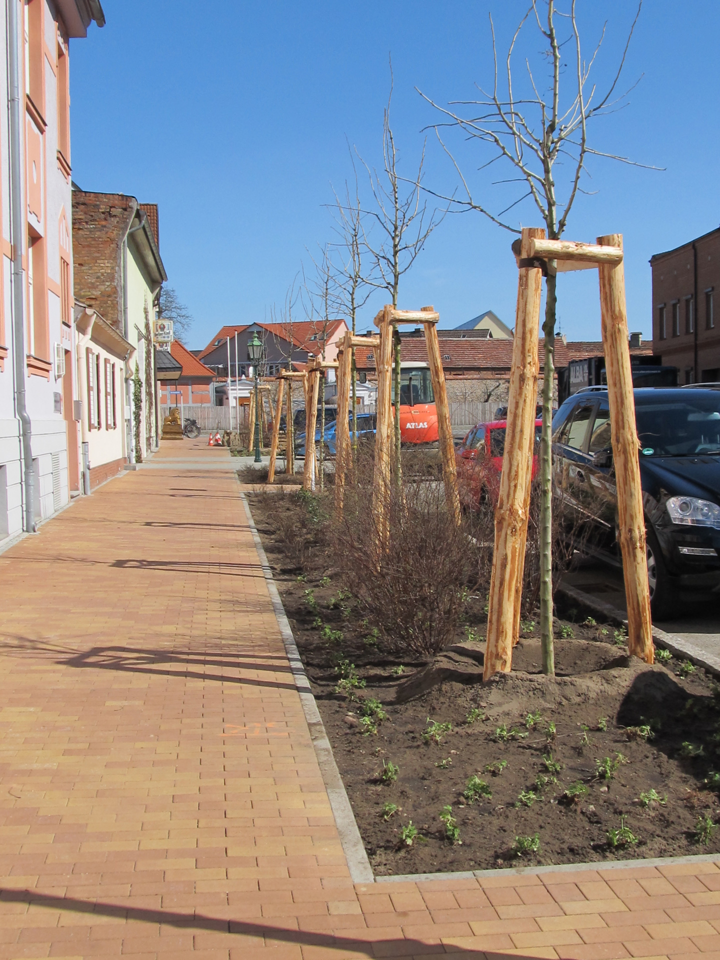 Vom Karlsplatz bis zur Auguststraße wurden nun nach der Rekonstruktion der Heinersdorfer Straße die Bäume und Gehölze gepflanzt. Ihren neuen Standort finden hier zwei Baumhasel, fünf Rotdorn und sieben Hahnendorn. Dazu kommen 1.300 Gehölze und Stauden.