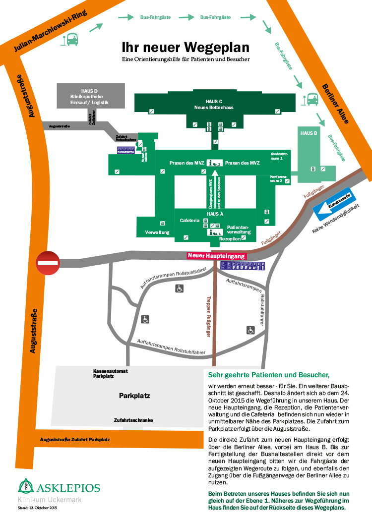Damit verändert sich auch die Wegeführung im Haus. „Der neue Haupteingang, die Rezeption, die Patientenverwaltung und die Cafeteria befinden sich dann wieder in unmittelbarer Nähe zum Hauptparkplatz des Klinikums“, sagt Regionalgeschäftsführer der Asklepios Kliniken in Schwedt und Pasewalk, Ulrich Gnauck. „Somit ziehen gleich mehrere zentrale Anlaufpunkte des Schwerpunktkrankenhauses in ihre neuen Räumlichkeiten um“, ergänzt er.