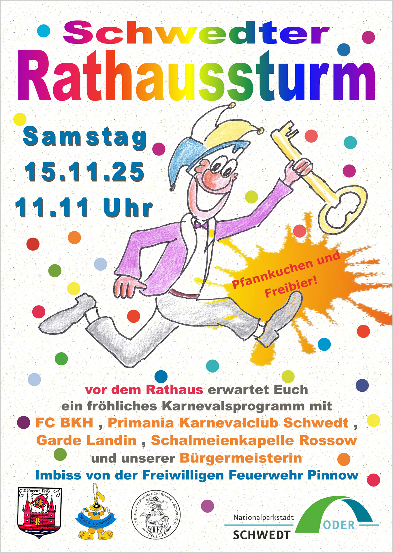 Am Samstag, dem 15. November 2025 werden die beiden Schwedter Karnevalsvereine FC BKH und Primania Karnevalsklub sowie die Garde Landin gemeinsam das Schwedter Rathaus in der Dr.-Theodor-Neubauer-Straße stürmen. Los geht’s pünktlich um 11:11 Uhr. Dann heißt es wieder „Schwedt Helau!“ Spaß, gute Laune und närrische Kritik in Richtung Rathausspitze und Regierungen in Potsdam und Berlin gehören zur Eröffnung der neuen Karnevalssession natürlich dazu.