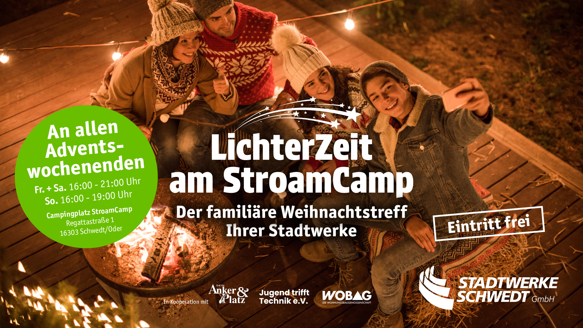 An allen vier Adventswochenenden laden die Stadtwerke Schwedt bei freiem Eintritt jeweils Freitag bis Sonntag zu diesem besonderen Adventserlebnis ein. Jedes Jahr sorgen die Stadtwerke bereits in der Vierradener Straße für eine weihnachtliche Beleuchtung. Dieses Jahr kommt die „LichterZeit“ am Campingplatz in der Regattastraße dazu. Vom 28. November bis 21. Dezember verwandelt sich die Zeltwiese des Campingplatzes StroamCamp in einen Ort voller Licht, Begegnung und adventlicher Stimmung.