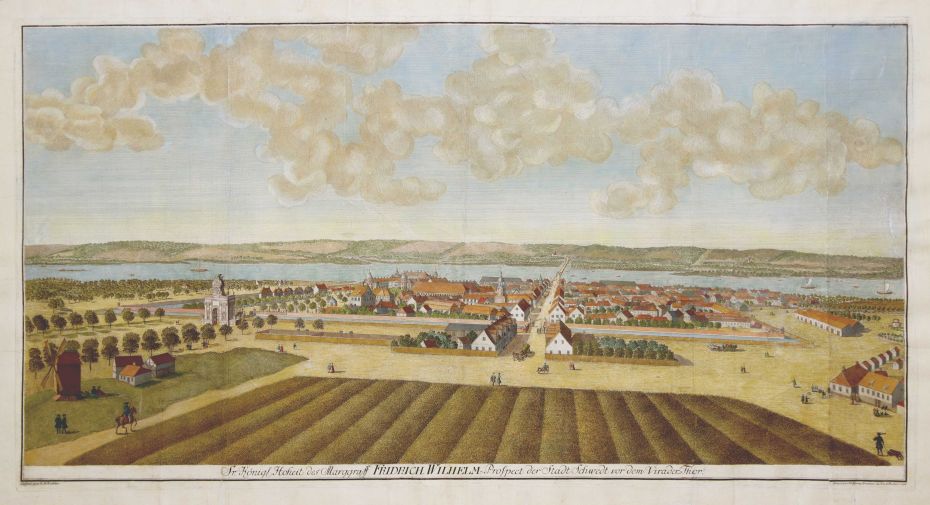 Kupferstich mit der Ansicht von Schwedt aus Richtung Nordost: „Sr. Königl. Hoheit der Marggraff FRIDRICH WILHELM Prospect der Stadt Schwedt vor dem Virader-Thor“.
