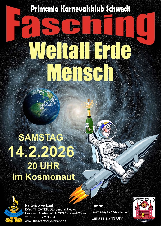 Faschingsfreunde und Fans des Primania Karnevalsklub Schwedt sind am Samstag, dem 14. Februar 2026, um 20 Uhr herzlich eingeladen, im Saal des „Kosmonaut“ in der Berliner Straße 52a wieder fröhlich zu feiern. Einlass ist ab 19 Uhr.