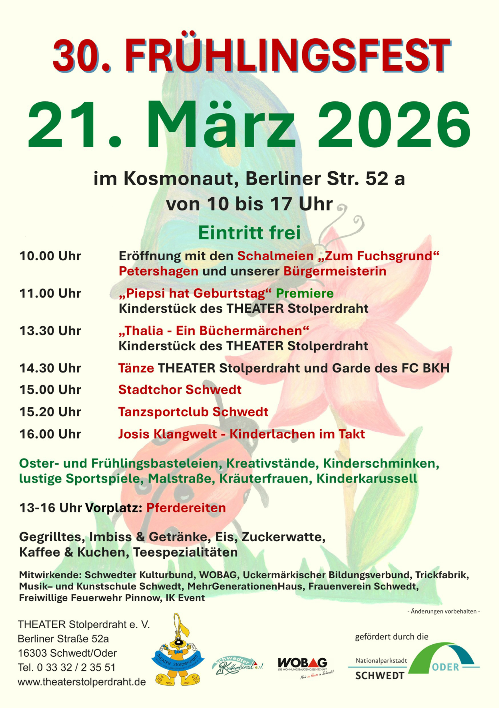 Am Samstag, dem 21. März 2026 wird im „Kosmonaut“ in der Berliner Straße 52 a der Frühling eingeläutet. Zum 30. Mal richtet das Theater Stolperdraht gemeinsam mit dem Kulturbund und vielen