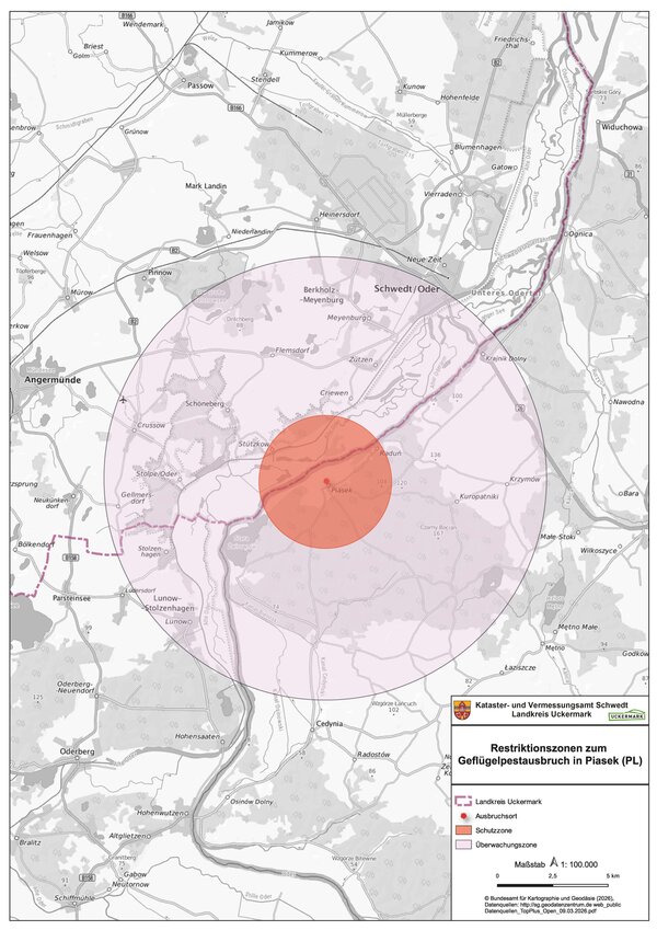 Eine Tierseuchenallgemeinverfügung wurde auf der Internetseite des Landkreises Uckermark unter www.uckermark.de veröffentlicht. Eine Schutzzone mit einem Radius von mindestens drei Kilometern rund um den Ausbruchsort sowie eine Überwachungszone mit einem Radius von mindestens zehn Kilometern wurde eingerichtet (s. beigefügte Karte). In diesen Zonen gelten besondere Sicherheitsmaßnahmen, wie Verbringungsverbote und Stallpflicht für Geflügel.