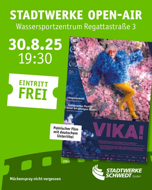 Sommerabend, Sternenhimmel, Kinozauber: Die Stadtwerke Schwedt laden gemeinsam mit dem FilmforUM Schwedt und dem Uckermärkischen Bildungsverbund gGmbH zu einem besonderen Filmabend unter freiem Himmel ein. Am Samstag, dem 30. August 2025, verwandelt sich das Gelände des Wassersportzentrums ab 19:30 Uhr in ein Freiluftkino der besonderen Art. Gezeigt wird der polnische Dokumentarfilm „Vika!“, der das Leben der außergewöhnlichen 84-jährigen DJane Vika porträtiert.