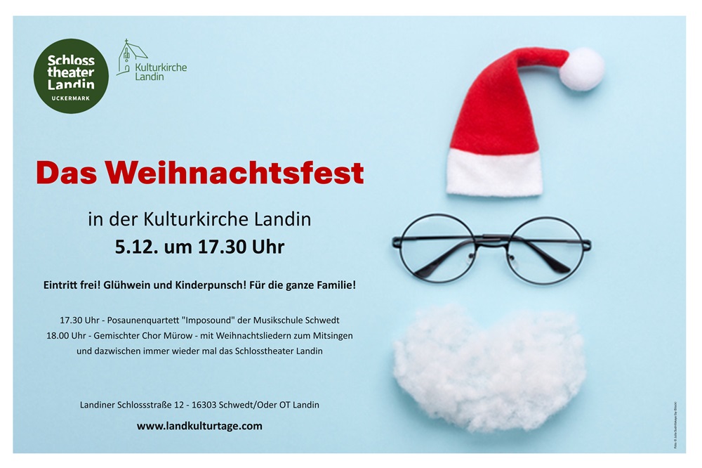 Das Schlosstheater lädt zum Weihnachtsfest in die Kulturkirche ein. Mit dabei in diesem Jahr das Posaunenquartett „Imposound“ der Musik- und Kunstschule Schwedt und der „Gemischte Chor“ aus Mürow. Die Kinder des Schlosstheaters lesen zwischendurch weihnachtliche Gedichte vor. Es gibt Glühwein, Kinderpunsch, Kaffee und Plätzen. Alles bei freiem Eintritt, aber gegen eine Spende beim hinausgehen.